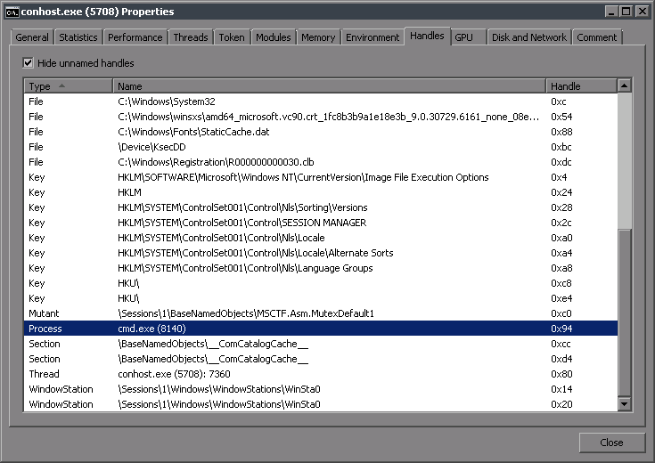 A handle entry scan returns an entry with an OwnerPID matching that of conhost.exe and an ObjectType of 0x07, which is a Process on Vista+. The cmd.exe PID is obtained by duplicating the handle in HandleValue and calling GetProcessId. Since OwnerPID equals 0x3A14 and the value returned from GetProcessId is 0x22B4, we have a match.