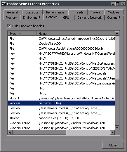 The only correlation (that I could find) between the cmd.exe process and the process that holds it’s command history, is that csrss.exe / conhost.exe has an open handle to the associated cmd.exe process.