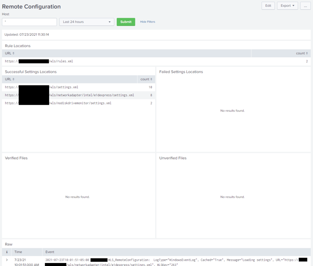 All relevant Remote Configuration activity is logged and a Splunk dashboard is provided in the WLS App for Splunk.
