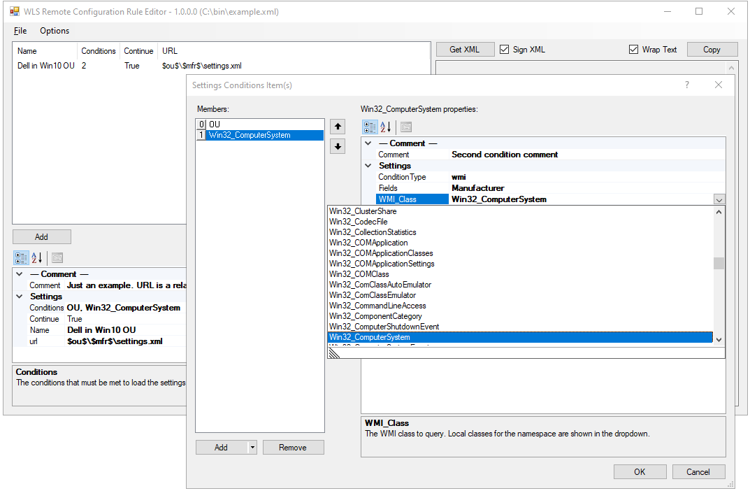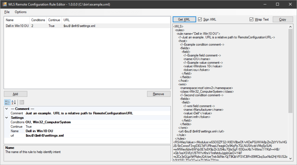 The Remote Configuration Rule Editor is provided to help with creating the rules.xml file. XML is the native format used and it can be edited without the use of the editor. If the file is signed, editing the file will invalidate the signature until it is resigned for the new content. Rule names and any comments are for user reference only and are not used by WLS.